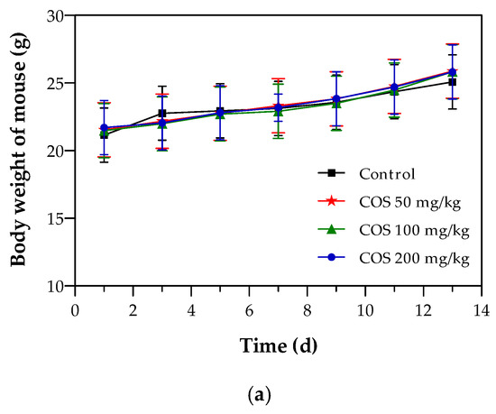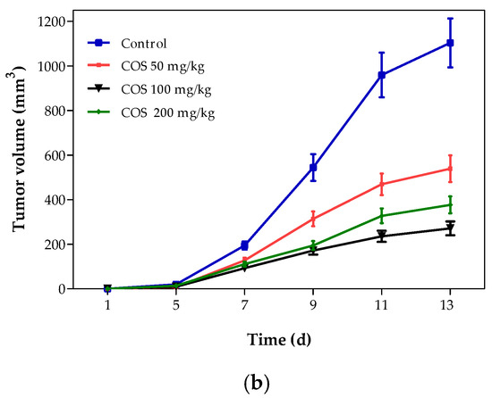 Oral route of administration is the most convenient and common and is preferred for clinical therapy. Many drugs have been prepared in oral dosage form. Moreover, COS was prepared as a functional food or dietary supplement to prevent cancer, so the mice were orally administrated in this study. The body weight of each mouse was weighed every other day (Figure 4a). No significant differences were observed in the body weights among the different groups throughout the experimental period (p > 0.05). While all the mice weighed roughly 20 percent more from the first day to the last day, there was no distinct difference in the body weight changes after COS treatment compared with the control group, intimated that there was no drug-induced toxicity in the dosage instructions given [44]. Therefore, the inhibition of COS on Lewis solid tumor did not rely on toxicity. To assess the effect of COS on lung tumor growth, mean tumor volumes were calculated and compared between the control group and different treated groups (Figure 4b). As early as 7 days after inoculation, COS inhibited tumor cell growth had a conspicuously small tumor volume compared to the control (p < 0.05). 13 days later, the treated groups, especially at intermediate and high doses, showed significant reductions in the tumor volume, which was different to the control group. Overall, the anti-proliferative effect of COS on the growth of lung tumor in mice was achieved in a time-dependent manner.