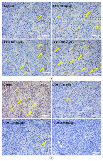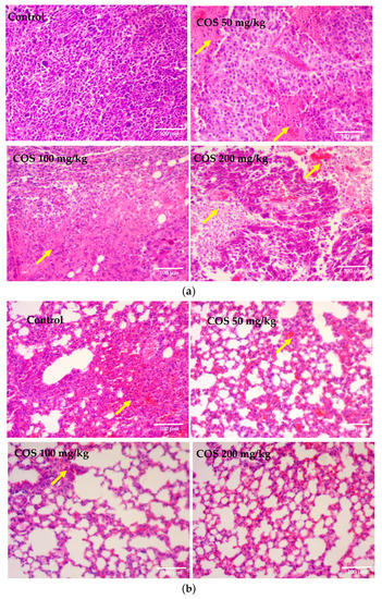 Tumor tissues of Lewis tumor-bearing mice were processed for H-E staining to determine the presence of apoptosis cells. In COS treatment groups, a relatively lower nuclear to cytoplasmic ratio in the tumors was observed compared to the control group. Marked changes in the morphology of the nucleus in COS-treated groups were also observed, such as karyorrhexis and nucleus fragmentation. Conversely, the individual cells in the control group were clearly visible in appearance, in which no obvious morphological changes were observed (Figure 5a). The morphological changes of lung tissues treated with COS were evaluated by H-E staining. As shown in Figure 5b, lung cells in the control group arranged in disorder, obvious edemas, and vacuolar degeneration could be seen. While in COS treatment groups, lung tissues exhibited relieving in the edema formation and vacuolar degeneration. H-E staining demonstrated that COS administration increased apoptosis of the tumor and repaired lung injuries in Lewis tumor-bearing mice.