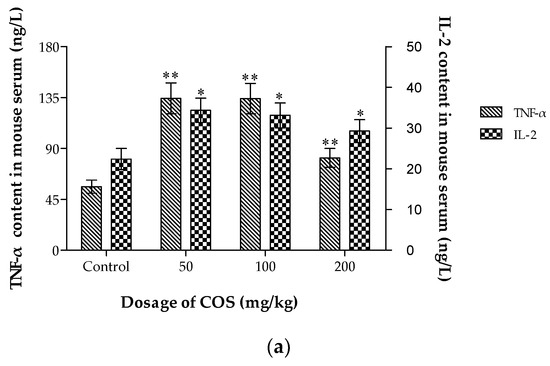 Different types of lymphocytes have different roles in tumor suppression [53]. TNF-α acts as a key mediator for local inflammation and cancer development. TNF-α can enhance host immune function and induce the apoptosis of tumor cells [54]. IL-2 has been used extensively in murine cancer models and human clinical trials due to its effects in activating different effector components of anti-tumor immune responses [55]. The Fas-FasL system plays a crucial role in the counterattack of cancer cells against the immune system [56]. Fas belongs to the TNF/nerve growth factor receptor family, and it mediates apoptosis [57]. Fas-L, upon engaging and activating the Fas receptor on the surface of infected cells, delivers a death signal [58]. To assess cytokine secretions associated with the anti-tumor activities induced by COS in Lewis tumor-bearing mice, the cytokines levels in the serum were measured with ELISA kits (Figure 7). Treatment of the mice with COS (50, 100, 200 mg/kg) promoted TNF-α, IL-2, Fas, and Fas-L production in serum in Lewis tumor-bearing mice (p < 0.05). The results in the present study indicated that the immunomodulatory effects and the apoptosis-inducing function might be associated with the anti-tumor activity of COS. However, whether immunomodulation played an important role in COS-inhibited tumor growth was required to be investigated with more detail in the future.