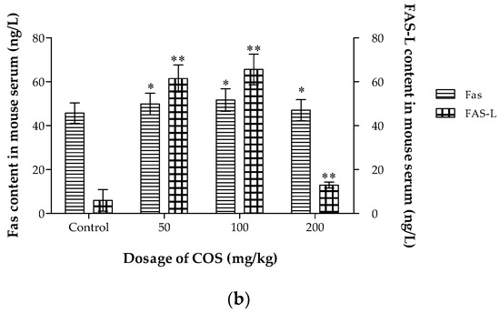 Figure 7. Effect of COS on serum TNF-α, IL-2 (a), and Fas, Fas-L (b) levels. Data represents mean ± SD, n = 12, * p < 0.05, ** p < 0.01 significant difference compared with control group.