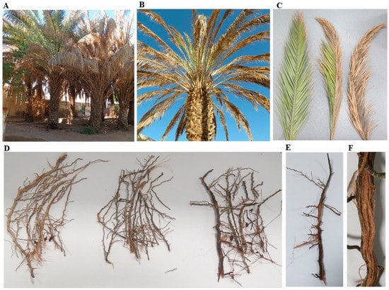 Under severe conditions, roots show reddish color (Figure 1D,E), fronds start drying up and the terminal bud is affected. In most cases, external symptoms are usually associated with highly colored vascular bundles (Figure 1F). Eventually, the entire tree dies within few months. Similar symptoms of decline then begin to appear on other leaves and pinnae. Thus, all palms are rarely found infected in an orchard at same time (Figure 1A). These symptoms on date palm are typical of the SDS that is known to be caused by a soil-borne fungus Fusarium spp.