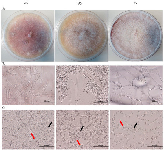 Morphological phenotypes mycelium and conidia of Fusarium spp. Mycelia of Fusarium spp. growing on a 10-day old PDA culture plate (A). Mycelium growth (B); and microconidia (red arrow) and macroconidia (black arrow) (C) of Fusarium spp. In (A–C), mycelia and conidia are from a 10-day old PDA culture. Fo, F. oxysporum; Fp, F. proliferatum; Fs, F. solani.