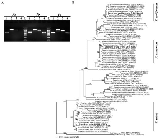 Identification of Fusarium spp. at the molecular level. PCR amplification of specific genomic DNA regions of infected root tissues (A); and dendrogram showing phylogenetic relationships among F. oxysoprum (Fo) species complex (DSM 106834), F. proliferatum (Fp) (DSM 106835), and F. solani (Fs) species complex (DSM 106836) identified in this study and other members of Fusarium spp. prepared by the maximum likelihood (ML) method (B). In (A), lanes 1–4 correspond to amplifications of ITS, 28S rDNA region, TEF1-α and β-tubulin in roots. In (B), the ML tree was obtained from combined ITS/LSU rDNA and TEFα-1 sequence data. The specimens used in this study carry GenBank accession numbers, Fo ITS/LSU rDNA (MH055398), Fo TEF1-α (MH087478), Fp ITS/LSU rDNA (MH055399), Fp TEF1-α (MH087479), Fs ITS/LSU rDNA (MH055400), Fs TEF1-α (MH087480). Numbers at the nodes are ML bootstrap values after 100 replicates are expressed as percentages (LnL = −8908.252933). The scale bar on the rooted tree indicates a 0.01 substitution per nucleotide position. The strains from this report are indicated in bold. Nectriaceae spp. NRRL 52710 (JF740791) and NRRL 52754 (JF740829) were used as outgroups. ITS, internal transcribed spacer; 28S rDNA, large subunit (LSU) of rDNA; TEF1-α, translational elongation factor 1-α; L, DNA ladder.