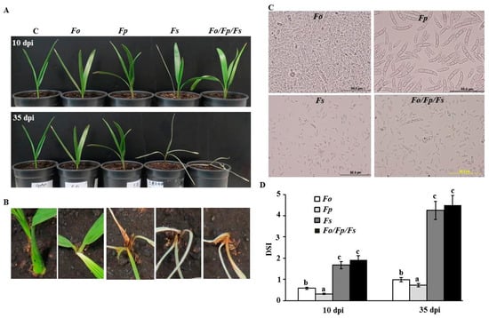 Pathogenicity and Koch’s postulate testing with Fusarium spp. Pathogenicity test on inoculated and non-inoculated date palm seedlings cv. Barhi at 10 dpi (top) and 35 dpi (bottom) (A); symptomatic tissues of the inoculated area of the seedling at 35 dpi (B); conidia after re-isolation of the pathogen from colonized tissues at 35 dpi (C); and disease severity index (DSI) of affected seedlings (n = 12) at 10 and 35 dpi (D). In (B), close-up views of infected stem and frond at 35 dpi of Fusarium-inoculated and non-inoculated seedlings. Young seedlings showing general whitening and dryness of stem and leaf tissues in F. solani and the three Fusarium spp. In (D), DSI is on a scale of 5: 0 = no infection, 1 = 1–10%, 2 = 11–25%, 3 = 26–50%, 4 = 51–75%, and 5 = 76–100% damage including necrosis, white area in leaves or rotting in roots. Values with different letters are significantly different from each other at p = 0.05. C, control (no infection); Fo, F. oxysporum; Fp, F. proliferatum; Fs, F. solani; Fo/Fp/Fs, all three Fusarium spp.; dpi, days post inoculation.
