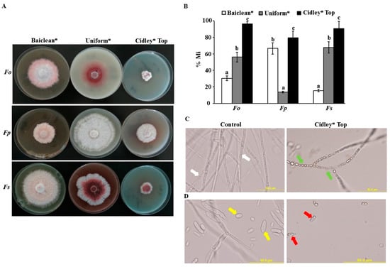 Efficacy of fungicides against Fusarium spp. in vitro. Effect of fungicides (250 ppm) on in vitro mycelial growth (A); growth inhibition rate (% Mi) of Fusarium spp. using 250 ppm of the fungicides after 10 days (B). Abnormalities in hyphal morphology, septum formation and cytoplasmic contents (C); and deformation of conidia (D) of F. solani following Cidely® Top treatment compared to control. In (B), values with different letters are significantly different from each other at p = 0.05; In (C), white arrows indicate normal septate hyphal growth; and green arrows indicate formation of non-septate hyphal formation and cytoplasmic coagulation. In (D), yellow arrows indicate normal formation of conidia; and red arrows indicate deformation of conidia. Fo, F. oxysporum; Fp, F. proliferatum; Fs, F. solani.