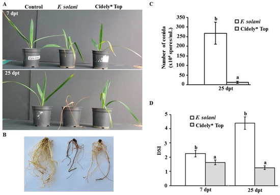 Effect of fungicide treatments on artificially inoculated date palm seedlings with F. solani in the greenhouse. Fungicidal suppression of Fusarium wilt disease on date palm seedlings cv. Barhi using Cidely® Top fungicide at 7 (top panel) and 25 (bottom panel) dpt (A); recovery of root tissues previously infected with F. solani using 250 ppm of Cidely® Top fungicide after 25 dpt (B). Number of conidia (×104 spores/mL) (C) and disease severity index (DSI) (D) after the application of Cidely® Top on date palm seedlings infected with F. solani (n = 12). In (D), DSI is on a scale of 5: 0 = no infection, 1 = 1–10%, 2 = 11–25%, 3 = 26–50%, 4 = 51–75%, and 5 = 76–100% damage including necrosis, white area in leaves or rotting in roots. In (C–D) Values with different letters are significantly different from each other at p = 0.05. In (A–D), seedlings inoculated with F. solani at 10 days before the fungicide treatment. Control, non-inoculated seedling; F. solani, infected seedlings with F. solani only; Cidely® Top, infected seedlings with F. solani and sprayed with Cidely® Top; dpt, days post treatment.