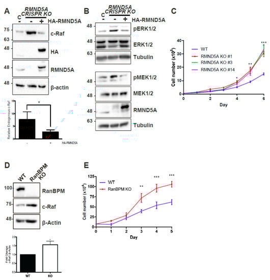 As RanBPM downregulation was previously reported to result in increased cellular proliferation [,], we evaluated whether the loss of RMND5A could also confer similar properties. Comparison of growth curves of wild-type (WT) and three different RMND5A CRISPR knockout HEK293 clonal derivatives showed that control cells slowed down after four days, whereas cells lacking RMND5A proliferated markedly faster starting at day 3 (Figure 1C). We also determined that, similar to the loss of RanBPM that we previously showed induced MEK and ERK phosphorylation [], the knockout of RMND5A resulted in increased MEK and ERK phosphorylation (Figure 1B). Interestingly, we found that primary mouse embryonic fibroblasts (MEFs) isolated from RanBPM KO mice also displayed increased c-Raf expression and increased proliferation (Figure 1D,E), suggesting that the consequences of the loss of RanBPM/CTLH complex are not restricted to immortalized cells.