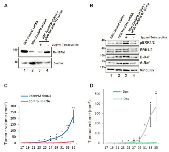Downregulation of RanBPM promotes tumour formation in NOD/SCID/gamma mice. (A) re-expression of RanBPM in HEK293 cells via Tet-off pBIG expression vector. HEK293 pool of cells stably expressing RanBPM shRNA were transfected with pBIG-RanBPM WT (si-mt) and maintained in media with 2 μg/mL Tetracycline and 250 μg/mL hygromycin to select for integration of the pBIG vector. Following selection, cells were either maintained (+) in Tetracyclin-containing media, or cultured in absence of Tetracyclin (−) for 24 h to allow induction of RanBPM. Tetracyclin removal leads to re-expression of RanBPM (lane 4); (B) ERK pathway activation in RanBPM shRNA cells. Samples shown in (A) were analyzed for ERK phosphorylation and A-Raf and B-Raf expression. The Western blot was analyzed with the indicated antibodies; (C) injections with HEK293 control and RanBPM shRNA pools were injected subcutaneously in the flank of 6–8 weeks old NOD/SCID/gamma. Tumour measurements were taken twice per week and a digital caliper was used to measure Length × Width × Depth of the tumour upon excision in order to calculate volume. n = 7, error bars represent SEM; (D) injections with HEK293 RanBPM shRNA pool of cells stably re-expressing RanBPM via pBIG Tet-off expression system (see C, lanes 3,4). Mice were fed chow containing Dox (purple line) or regular chow (green line). n = 6, error bars represent SEM. p < 0.05 (*), p < 0.01 (**). Error bars are included for all data points but may not be visible when smaller than line size.