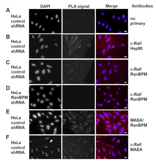 Endogenous RanBPM and c-Raf interaction in HeLa cells using PLA. Duolink II proximity ligation assay (PLA) was performed in: (A) control shRNA HeLa cells, without the addition of primary antibodies (negative control); (B) control shRNA HeLa cells, with Hsp90 and c-Raf primary antibodies (positive control); (C) control shRNA HeLa cells, using c-Raf and RanBPM primary antibodies; (D). HeLa RanBPM shRNA cells, with c-Raf and RanBPM primary antibodies (negative control); (E) control shRNA HeLa cells, using MAEA (Macrophage erythroblast attacher) and RanBPM primary antibodies (positive control). (F) Control shRNA HeLa cells, using c-Raf and MAEA primary antibodies. The DAPI filter was used to visualize the nuclei, while the Cyanine 3 (Cy3) filter was used to visualize the PLA dots representing protein–protein interactions. Representative images from one of three independent experiments are shown. Scale bars, 10 μm.