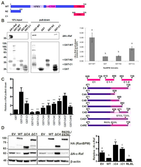 RanBPM C-terminal CRA domain directly interacts with ΔN-c-Raf and is necessary for C-Raf regulation. (A) diagram of WT RanBPM, N2 domain and C1 domain cloned into the bacterial expression vector pGEX-4T-1; (B) Left, Western blot analysis of GST pull-down assays for N c-Raf performed using GST, GST-WT-RanBPM, GST-N2-domain and GST-C1-domain E. coli extracts. A representative image is shown. Right, pull down assays experiments were quantified by normalizing ΔN-c-Raf levels to pulled-down GST, GST-WT-RanBPM, GST-N2 or GST-C1 and statistical analyses were performed (n = 6, error bar indicates SEM) with different letters indicating statistical difference (p < 0.05); (C) analysis of RanBPM CRA mutants using in vitro pull-down. Right, schematic representation of the mutants analyzed. Left, Quantifications of pull down experiments performed with the CRA mutants as described in (B). Relative ∆N-C-Raf protein levels were quantified by normalizing ∆N-C-Raf to the GST-fusion protein product, and comparing values to GST when set to a value of 1. Quantifications are shown with error bars indicating SD (n = 3–5). Statistical difference with respect to GST-C4 is indicated, * p < 0.05; ** p < 0.01; (D) analysis of RanBPM CRA domain mutants in mammalian cells. HeLa RanBPM shRNA cells were transfected with pEBG-GST-ΔN-c-Raf and either pCMV-HA empty vector, RanBPM WT, RanBPM-ΔC4, RanBPM-ΔC1, or RanBPM-R625L E626L, and whole cell extracts were prepared 24 h post-transfection and analyzed by Western blot. HA, c-Raf and β-actin antibodies were used to detect HA-RanBPM constructs, ∆N-c-Raf and β-actin proteins, respectively. Right, relative ∆N-c-Raf protein levels were quantified by normalizing ∆N-c-Raf to β-actin, and comparing values to HA-WT when set to a value of 1. Different letters are statistically different (p < 0.05). Error bars indicate SD (n = 4).