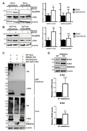 Since the CTLH complex has E3 ubiquitin ligase activity [], we wanted to determine whether it regulates c-Raf protein stability through the proteasomal degradation pathway. RanBPM shRNA and control shRNA HeLa, and HCT116 cells were used to assess c-Raf protein levels in conditions of proteasomal impairment in order to determine whether RanBPM loss of function would affect c-Raf degradation. All cell lines were treated with either 10 µM of the proteasome inhibitor, MG132, or with the vehicle, dimethyl sulfoxide (DMSO). HeLa and HCT116 cells expressing RanBPM shRNA showed minimal accumulation of c-Raf protein levels during proteasomal inhibition, whereas control shRNA cells exhibited a significant increase of c-Raf expression when compared to their respective vehicle-treated controls (Figure 6A,B). This suggests that the downregulation of RanBPM impairs proteasome-dependent degradation of c-Raf. To determine whether this could occur through ubiquitination of c-Raf by the CTLH complex, we co-transfected control and RMND5A KO HeLa cells with GST-ΔN-c-Raf and HA-Ubiquitin constructs to investigate the involvement of RMND5A in c-Raf ubiquitination. GST-ΔN-c-Raf ubiquitination was observed in control Hela cells but was strongly reduced in RMND5A KO cells confirming that the CTLH complex regulates c-Raf ubiquitination (Figure 6C). Taken together, our data suggests that c-Raf ubiquitination and proteasomal degradation is regulated by the CTLH complex.