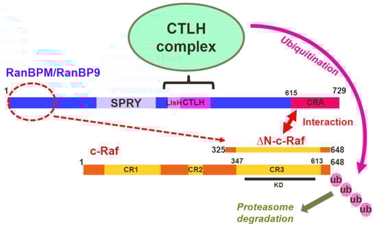 The regulation of Raf kinases is central to the signaling activities of the ERK pathway [,,]. In this study, we have identified a novel regulatory mechanism of c-Raf protein expression. The data presented here show that the CTLH complex, a yet uncharacterized E3 ubiquitin ligase complex, affects c-Raf stability and promotes its ubiquitination. One of the CTLH complex subunits, RanBPM, interacts directly with the C-terminal domain of c-Raf through its CRA domain. Preventing this interaction or interfering with CTLH subunit expression results in increased c-Raf expression and loss of its ubiquitination. Our data suggest a model whereby RanBPM is the targeting subunit necessary for c-Raf recruitment to the CTLH complex for ubiquitination (Figure 7).