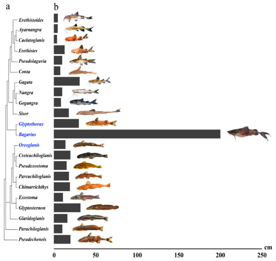 Intergeneric phylogenetic relationships and body length differences in Sisoridae. (a) phylogenetic relationships recreated based on a previous study [13]; (b) the maximum body length recorded for each genus based on Fishbase (http://www.fishbase.org/search.php). The photographs present a typical appearance for each genus, among which Conta, Erethistes, Erethistoides, Gogangra, Nangra, Pseudolaguvia, and Sisor were provided by courtesy of Heok Hee Ng, Ayarnangra, Caelatoglanis, and Gagata by courtesy of Kamphol Udomritthiruj, Parachiloglanis by courtesy of Ryan Thoni, and the others were taken by the first author (Wansheng Jiang). The genera that include the species in this study are highlighted in blue.