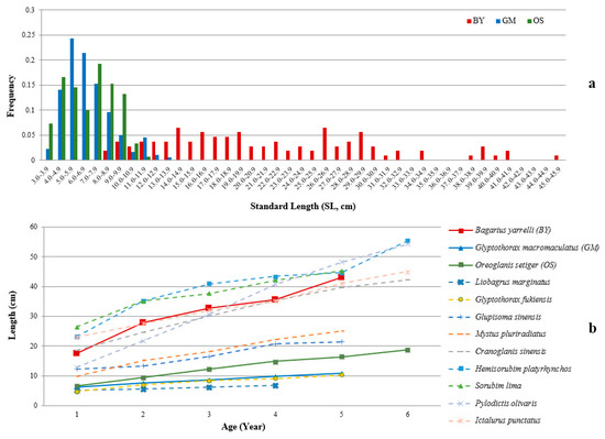 Length frequency distributions and preliminary age estimations of Bagarius yarrelli (BY), Glyptothorax macromaculatus (GM), and Oreoglanis setiger (OS). (a) length frequency of the specimens deposited in the Kunming Natural History Museum of Zoology, Chinese Academy of Sciences; (b) age–length relationship of BY, GM, OS (solid line) and other eight catfish species (dotted line).