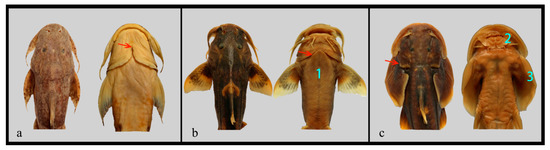 The front half body view of BY (a), GM (b), and OS (c). Arrows indicate the end of gill openings, and the numbers indicate the modified epidermal adhesive structures as follows: (1) thoracic adhesive apparatus; (2) adhesive sucker; and (3) adhesive unbranched rays.