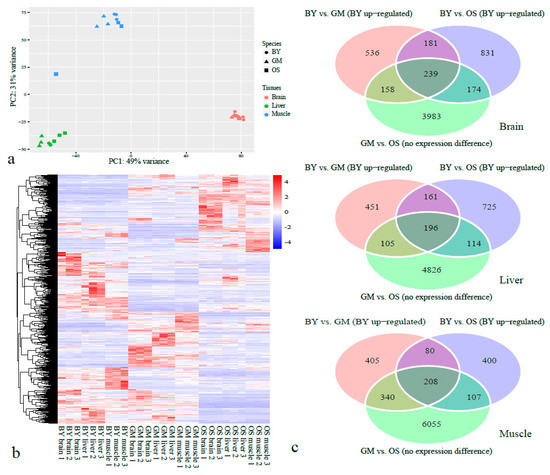 Overview of the expression differentially expressed genes (DEGs) identified in BY relative to GM and OS species. (a) the principal component analysis of the overall gene expression among three tissues in three species; (b) a heatmap of the overlapped DEGs between any of the two in six DEG datasets. The six DEG datasets were obtained from the comparisons between BY vs. GM and BY vs. OS in three tissues; (c) Venn diagrams of upregulated BY DEGs when compared with GM and OS samples for all three types of tissues, with the overlapping genes showing no statistical transcriptional differences between GM and OS.