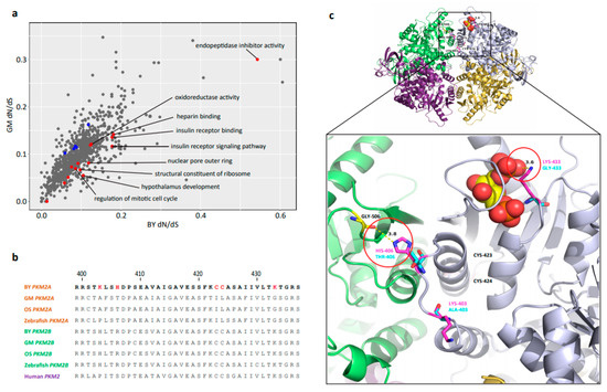 Fast-evolving genes (FEGs) enrichment and PKM2A sequence alignment and protein structure. (a) comparison of dN/dS ratios between BY and GM using gene ontology (GO) functional categories; highlighted red dots indicate GO terms with elevated evolutionary rates in BY that may be related to growth and proliferation, and blue dots indicate these GO terms with reduced evolutionary rates in BY; (b) sequence alignments of PKM2A & PKM2B between BY (red indicates positive selection sites), GM, OS, and zebrafish, with human PKM2 included; (c) the construction of the PKM2A protein of BY, GM, and OS, with human PKM2 used as a template (PDB id: 3srd). A possible hydrogen bond between H406 and G506, and an affinity enhancement between K433 and FBP (the red and yellow spheres) via the charge attraction of BY (in magenta) can be seen in the red cycle; no similar link was found between GM and OS (in cyan).