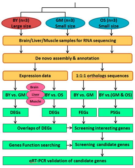 To organize the above methods in this study, a flowchart illustrating the overview of comparative transcriptome analyses is provided in Figure 6. In summary, the three reference transcriptomes of large-sized BY and small-sized GM and OS were assembled independently by pooling the conspecific libraries. For each species, the expression data of each library (three tissues in three individuals) were counted, normalized, and then employed for identifying the DEGs. The putative one-to-one orthologs were identified across the three species, and were then used in the identification of FEGs and PSGs. To obtain the BY-specific expression patterns in various tissues, progressive screening of DEGs was performed. Initially, we identified the BY upregulated DEGs by comparing BY vs. GM and BY vs. OS separately, with the goal of detecting similar DEG enrichment patterns. Additionally, we narrowed down the DEG lists by finding overlapped genes in BY vs. GM and BY vs. OS. These BY-specific overlapping DEGs may be attributed to their unique phenotypic feature of having an extraordinarily large size among Sisoridae. Furthermore, we determined the proportion of overlapping DEGs by searching for those with no transcriptional differences between GM and OS, which acted as the most rigorous condition to identify BY-specific expression patterns. Because evolutionary rates and the selection signals of coding genes might also contribute to the large BY body size, FEGs and PSGs were examined by counting the BY-specific mutation sites. As we assumed that the BY-specific genetic basis of body size evolution would be global across multiple tissues, the co-upregulated BY DEGs (observed in at least two tissues) plus the BY PSGs were treated as a specific gene dataset. By screening the known functions of all these genes of interest, we obtained the final body size-related candidate genes. We also sampled some of the candidate genes via qRT-PCR to validate RNA-Seq transcriptome profiles in this study.