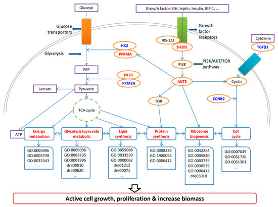 Among all these candidate genes, for instance, AKT3 and adaptor protein 1 (SH2B1) are two important growth related modulators that can regulate growth, proliferation, and biosynthetic processes at multiple levels; ribosomal protein S3 (RPS3) is a multi-functional ribosomal protein; heat shock cognate 70-kd protein and tandem duplicate 2 (HSP70.2) and its carrier protein (HIKESHI) can regulate many processes including metabolism, cell proliferation and growth; polycomb group ring finger 1 (PCGF1), transcription factor Dp-2 (TFDP2), TGFβ3, CCNB2 are all functionally relevant to the cell cycle; and PKM2A and HK2 are two important kinases in the process of glycolysis (see more details in the Discussion).