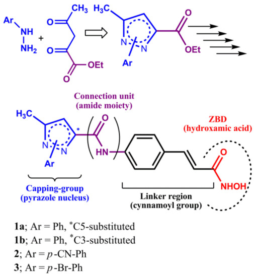 On the basis of these fruitful features, we report herein the synthesis of two sets of new potential HDACIs in which the hydroxamic acid moiety was maintained as a steady point for the zinc-binding. The cinnamoyl group was used to resemble the classical six methylene groups linker, and a pyrazole scaffold (joined to the linker throught an amide connection unit) was elected as capping group to achieve potency and possibly selectivity for the different HDAC isoforms. The cinnamoyl hydroxamic acid is a well-known and fruitfully exploited chemical fragment for HDACs inhibition [8,9,10,11,12,13]. Indeed, some cinnamoyl hydroxamates such as Belinostat (peripheral T-cell lymphoma) and Panobinostat (multiple myeloma) have been already approved by the FDA for the anticancer combination therapy. On the other hand, the pyrazole scaffold has been recently reassessed as a valid surface recognition motif [14,15].