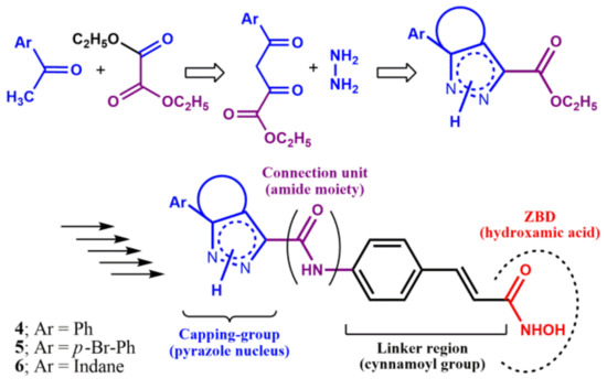 Design of the second set of HDACIs (aryl-substituted N1-H-pyrazole derivatives). For synthetic details, see Schemes S2 and S3.