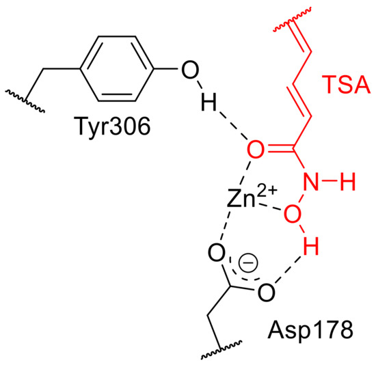 In order to explain the different ability of the compounds 1–6 to inhibit HDAC enzymes, we performed a docking simulation using the active site of the three-dimensional structure of the HDAC8 enzyme. In fact, except for HDAC8, functional HDACIs were found as high-molecular-weight multiprotein complexes, and most purified recombinant HDACIs are enzymatically inactive [22]. Therefore, HDAC8 is the best model among mammalian HDACIs if we look at it from a structural biology perspective. Thus, looking at the pose of TSA in the co-crystallized structure with the human HDAC8 (PDB ID: 1T64) and considering that hydroxamic acid group chelates the zinc ion in a bidentate fashion and forms hydrogen bonds with Tyr306 and Asp178 (Figure 5) we docked compounds 1–6 starting from this pose.