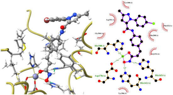 The molecular docking simulations of all new compounds showed that the trend of activity is maintained along the series but with about a 10-fold underestimated value [23,24,25]. However, the same order is maintained for the TSA and suberoylanilide hydroxamic acid (SAHA), the two most famous HDACIs, chosen as reference compounds (Table 1) and used to validate the docking procedure. The 3D and 2D sketch of the docked pose for the best-scored compound 3 (Figure 6) highlight that this compound chelates the Zn2+ bidentately, as expected, whereas a hydrogen bond is established between hydroxamic NH hydrogen and His143, while another with OH hydrogen and His142. Moreover, a series of π–π stacked interactions occur between the aromatic rings and Phe152, Phe208, His180, and Tyr100; furthermore, a π-anion interaction involves the pyrazole ring and Asp101 (Figure 6).