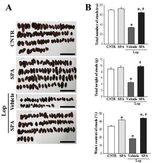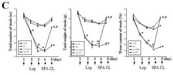 The number, weight, and water content of the stools of Lop-induced constipated SD rats after SPA administration. (A) The digital camera images of the stools were taken immediately after collection from the metabolic cage. Scale bar was represented 3 cm. (B) At 5 days, the total number and weight of stools were measured as described in the materials and methods. The stool water content was calculated using the weight of fresh stools and the dried weight. (C) From the 1st day to the 5th day, the total number, weight, and water content of stools was measured as described in the materials and methods. Six to seven rats per group were used in the stools’ collection, and each parameter was assayed in triplicate. The data are reported as the mean ± SD. * p < 0.05 compared to the CNTR group. # p < 0.05 compared to the Lop + Vehicle-treated group. CL, final collection.