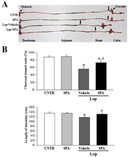 To investigate whether the SPA administration can induce changes in the gastrointestinal motility, the charcoal meal transit test was performed in Lop + SPA-treated SD rats. The propulsion of the charcoal meal was significantly decreased 37.5% in the Lop + Vehicle-treated group compared with CNTR group. However, this propulsion was recovered after the administration of SPA (Figure 2). Also, a similar pattern was observed on the length of the intestine. These results suggest that the SPA administration can promote gastrointestinal motility in the Lop-induced constipation model.