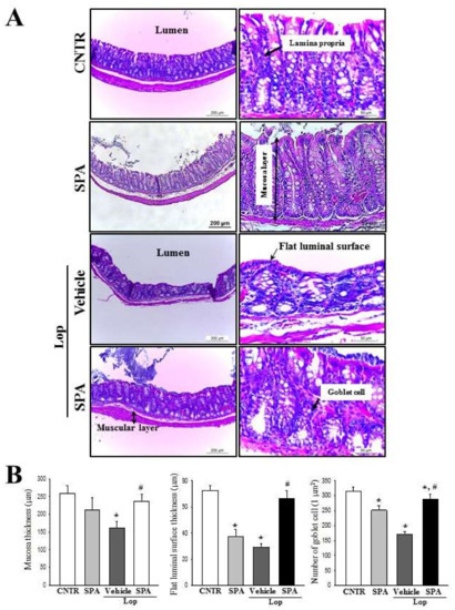 The colons collected from CNTR, SPA-, Lop + Vehicle-, and Lop + SPA-treated SD rats were fixed with 10% formalin for 48 h. The samples were subsequently embedded in paraffin wax, after which they were cut into 4 μm thick sections and stained with hematoxylin and eosin (H&E, Sigma-Aldrich Co.). The sections were then analyzed for mucosa thickness, flat luminal surface thickness, and number of goblet cells in the colons by light microscopy and the Leica Application Suite (Leica Microsystems, Switzerland).