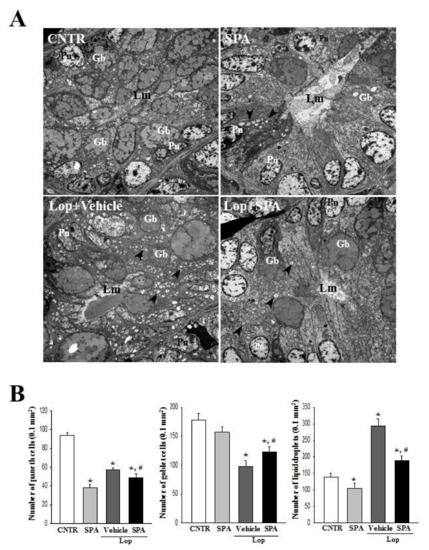 An ultrastructure image of the colon after SPA administration: (A) The ultrastructure of the crypt in the CNTR, SPA-, Lop + Vehicle- and Lop + SPA-treated groups were viewed by TEM at 4000× magnification. (B) The number of paneth cells, lipid droplets, and goblet cells were measured using Leica Application Suite (Leica Microsystems, Switzerland). The arrow indicates a lipid droplet distributed around the lumen of the crypt. Two to three rats per group were used in the TEM analysis, and each parameter was measured in duplicate in two different slides. The data are reported as the mean ± SD. * indicates p < 0.05 compared to the CNTR group. # indicates p < 0.05 compared to the Lop + Vehicle-treated group. Lm, lumen of crypt; Gb, goblet cells; Pn, paneth cells.