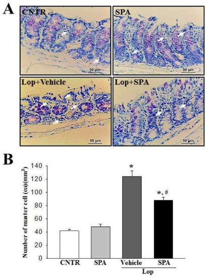 To examine whether SPA administration can induce the infiltration of mast cells, the number of infiltrated mast cells was measured in the colon of the Lop-induced constipation model. A higher numbers of mast cells stained blue in the Lop + Vehicle-treated group were observed than in the CNTR group. However, their numbers were remarkably decreased by 32% in the Lop + SPA-treated groups (Figure 5A,B). These data suggest that SPA may contribute to the suppression of mast cell infiltration in the colon of the Lop-induced constipation model.