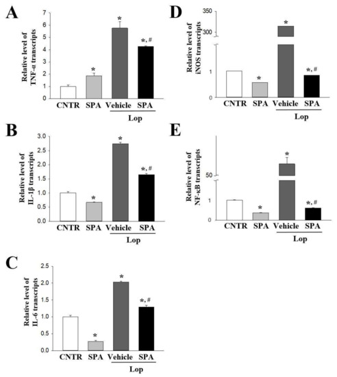 The levels of inflammatory cytokines and their mediators after SPA administration: The transcripts levels of three inflammatory cytokines (TNF-α, IL-1β, and IL-6) (A–C) and two inflammatory mediators (NK-κB and iNOS) (D,E) were detected in the colon by a quantitative real-time PCR analysis using specific primers. The intensity of each band was determined densitometrically, and the relative level was calculated based on the intensity of the β-actin transcript as an endogenous control. Four to five rats per group were used in RNA purification, and cytokine levels were assayed in duplicate in each sample. The data are reported as the mean ± SD. * indicates p < 0.05 compared to the CNTR group. # indicates p < 0.05 compared to the Lop + Vehicle-treated group.
