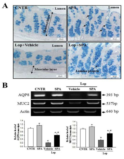 The detection of mucin secretion and membrane water channel expression in the colon after SPA treatment: (A) Mucin secreted from the crypt layer cells was stained with Alcian Blue at pH 2.5, and the images were observed at 100× magnification. Five to six rats per group were used in the preparation of the tissue slide and mucin secretion observed in duplicate in three stained slides. (B) The levels of MUC2 and AQP8 transcripts in the total mRNA of the colons were measured by RT-PCR using specific primers. After the intensity of each band was determined using an imaging densitometer, the relative levels of MUC2 and AQP8 mRNA were calculated based on the intensity of actin as an endogenous control. Four to five rats per group were used in RNA purification, and each transcript levels were assayed in duplicate in each sample. The data are reported as the mean ± SD. * indicates p < 0.05 compared to the CNTR group. # indicates p < 0.05 compared to the Lop + Vehicle-treated group.