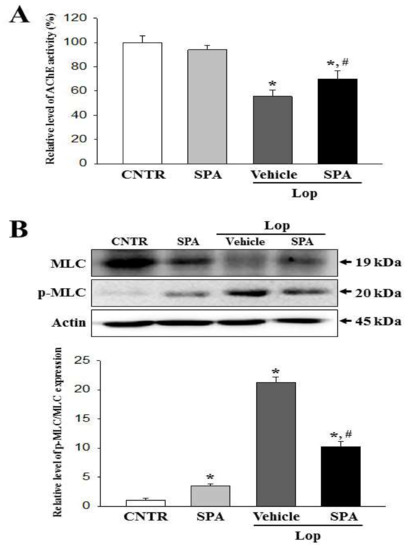 A recovery pattern was also observed in the AChE activity when assessing the response of the colon smooth muscle cells as target cells for ACh, although they showed an opposite pattern. The phosphorylation level of myosin light chains (MLC) was higher in the Lop + Vehicle-treated group than in the CNTR group. However, these levels were remarkably recovered in the Lop + SPA-treated group (Figure 8B). Taken together, the above results suggest that the SPA-induced cholinergic recovery may be linked to regulating the phosphorylation of MLC in smooth muscle cells.