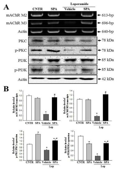 The expression of mAChRs and key mediators within their downstream signaling pathway in the colon after SPA treatment: (A) Resulting image of RT-PCR and western blot analyses. The levels of mAChR M2 and M3 transcripts in the total mRNA of colons were measured by semiquantitative PCR using specific primers. After the intensity of each band was determined using an imaging densitometer, the relative levels of mAChR M2 and M3 were calculated based on the intensity of actin. The expression of several related proteins, including PKC, p-PKC, PI3K, and p-PI3K, in the mAChR M2 and M3 signaling pathway were measured by a Western blot analysis using the HRP-labeled anti-rabbit IgG antibody. (B) Relative level of each protein expression. After the intensity of each band was determined using an imaging densitometer, the relative levels of the four proteins were calculated based on the intensity of actin. Five to six rats per group were used in the preparation of the protein and RNA, and the western blot and RT-PCR analyses were assayed in duplicate in each sample. The data are reported as the mean ± SD. * indicates p < 0.05 compared to the CNTR group. # indicates p < 0.05 compared to the Lop + Vehicle-treated group.