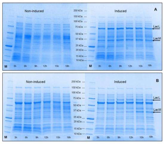 The fragment of lacLM genes, which was amplified with the primer pair FwdNcoI and Rev1XhoI (Table 5), was cloned into the expression vector pET-21d(+) (Novagen, Darmstadt, Germany) using the NcoI and XhoI cloning sites, resulting in the plasmid pET21lacLMLh. The constructed plasmid was transformed into electrocompetent cells of two different hosts, E. coli BL21 Star (DE3) and E. coli T7 Express harboring the plasmid pGRO7, which encodes the chaperones GroEL and GroES (Takara, Shiga, Japan), to compare the expression levels.