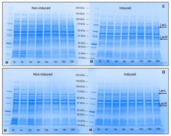 SDS-PAGE analysis of cell-free extract of crude Escherichia coli BL21 Star (DE3) (A), E. coli T7 Express containing the plasmid pGRO7 (B), Lactobacillus plantarum WCFS1 (C) and L. plantarum TLG02 (D) overexpressing β-galactosidase from Lactobacillus helveticus DSM 20075. E. coli BL21 Star (DE3) and T7 Express GRO carrying the plasmid pET21lacLMLh were cultivated in 300 mL LB medium; whereas L. plantarum WCFS1 and L. plantarum TLG02 harboring the plasmids p409lacLMLh and p609lacLMLh, respectively, were cultivated in 500 mL MRS at 30 °C. The cultivation and induction conditions are as described in Materials and Methods and samples were taken at different time points during cultivations (non-induced cultures) and after induction during cultivations (induced cultures). The arrows indicate the LacL and LacM subunits of the recombinant β-galactosidase. M denotes the Precision protein ladder (Biorad, CA, USA).