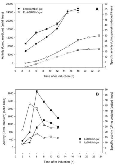 The SDS-PAGE analyses of cell-free extracts (Figure 1C,D) confirm the production of two recombinant β-galactosidases, Lp409Lhβ-gal and Lp609Lhβ-gal. β-Galactosidase activities of the wild-type host strain L. plantarum WCFS1 and the expression strains, L. plantarum WCFS1 and L. plantarum TGL2, carrying the plasmids p409LacLMLh and p609LacLMLh under non-induced conditions, respectively, were not detected. L. plantarum harboring p409lacLMLh, which was constructed based on an erythromycin (ery) based pSIP409 expression vector [,] (as described in Materials and Methods), showed the highest enzyme yield of ~2.90 ± 0.05 kUoNPG of β-galactosidase activity per L of medium and the corresponding specific activity of 24.3 ± 1.2 U mg−1 after 6 h of induction (Figure 2B). This yield is somewhat lower when compared with the yields obtained for both LacLM-type and LacZ-type β-galactosidases from lactic acid bacteria. When overexpressing β-galactosidases from L. reuteri (LacLM-type), L. bulgaricus (LacZ-type) and Streptococcus thermophilus (LacZ-type) in the host L. plantarum WCFS1 using pSIP409 expression vectors, the yields obtained were ~29 kU, ~22 kU, and ~11 kU of β-galactosidase activity per liter of culture, respectively [,,]. L. plantarum harboring p609lacLMLh, which was constructed based on p409lacLMLh and pSIP609, a food-grade alanine racemase (alr) based expression vector [] (as described in Materials and Methods), showed slightly lower expression yield, which was 2.30 kU ± 0.03 kUoNPG of β-galactosidase activity per L of medium (Figure 2B), compared to L. plantarum harboring p409lacLMLh. This obtained yield is 14-fold lower than the amounts of L. reuteri β-galactosidase produced using this alr-based system []. Lactobacillal pSIP expression systems are strictly regulated and have been proven to overproduce a number of enzymes in Lactobacillus hosts [,,]. However, a discrepancy between the yields of expressed proteins was observed as discussed above. Despite higher expression in E. coli, the use of the food-grade expression vector (pSIP609) and host organism (L. plantarum) has the potential for the production of food-grade enzyme [,] and allows the use of crude β-galactosidases in food and feed applications, hence the enzyme costs can be reduced by avoiding laborious and expensive chromatographic steps for the purification of the biocatalyst.