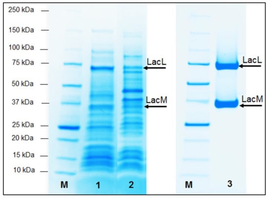SDS-PAGE analysis of crude and purified β-galactosidase (lacLM) from L. helveticus DSM 20075 overexpressed in E. coli BL21 Star (DE3) and L. plantarum WCFS1. Lane 1, whole-cell lysates of E. coli BL21 Star (DE3) carrying the plasmid pET21lacLMLh with 1 mM isopropyl-β-d-thiogalactopyranoside (IPTG) induction at 25 °C for 18 h; lane 2, whole-cell lysates of L. plantarum WCFS1 containing p409lacLMLh with 25 ng/mL inducing peptide pheromone IP-673 at 30 °C for 8 h; lane 3, purified recombinant β-galactosidase EcoliBL21Lhβ-gal. The arrows indicate the LacL and LacM subunits of the recombinant β-galactosidase. M denotes the Precision protein ladder (Biorad, CA, USA).