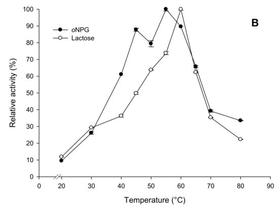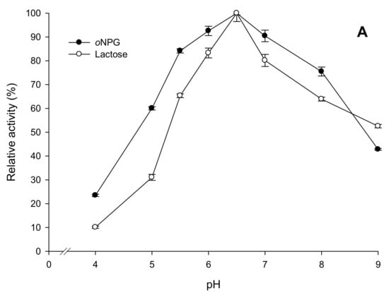 The pH optimum of EcoliBL21Lhβ-gal is pH 6.5 for both oNPG and lactose hydrolysis, and the enzyme exhibits more than 65% of the maximal activity in the pH range of 5.5–8 (Figure 4A). However, the enzyme is most stable at pH 5.5–6.0 with the half-life time (τ1/2) of activity at pH 5.5 and 6.0 were 816 and 552 h, respectively (Table 2). The pH profile of β-galactosidase from L. helveticus showed that it is slightly more active than β-galactosidases from L. reuteri [] and L. bulgaricus [] at mildly acidic pH. The enzyme is very unstable at pH below 5 and above 8 (Table 2).