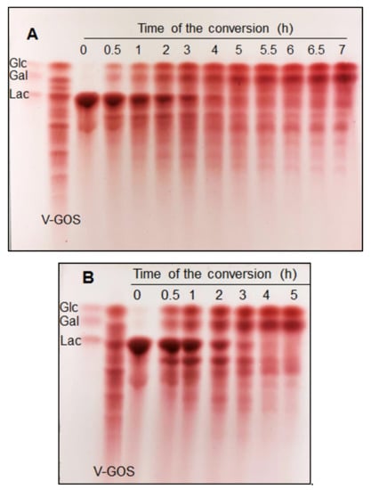 Both crude enzyme Lp609Lhβ-gal and purified enzyme EcoliBL21Lhβ-gal are more stable in the presence of high lactose concentration, retaining more than 75% and 60% of initial activity, respectively, after 24 h of incubation at 50 °C (data not shown). Thermostabilty of both crude enzyme and Lp609Lhβ-gal and purified enzyme EcoliBL21Lhβ-gal shows the potential of applications of these recombinant β-galactosidases in lactose conversion processes at temperatures up to 50 °C, whereas almost all lactobacillal LacLM-type β-galactosidases can be used in the applications, where the process temperatures can only be as high as 37 °C [,,,,]. Figure 5 shows the formation of GOS by recombinant β-galactosidases from L. helveticus, crude enzyme Lp609Lhβ-gal (Figure 5A) and purified enzyme EcoliBL21Lhβ-gal (Figure 5B), as analyzed by thin layer chromatography (TLC) in discontinuous lactose conversion processes at 50 °C using 205 g L−1 initial lactose in 50 mM sodium phosphate buffer (pH 6.5) containing 1 mM MgCl2 and 1.5 ULac mL−1 of recombinant β-galactosidase. A commercial GOS preparation, Vivinal (Friesland Foods Domo), was used for comparison (indicated by V-GOS). The conversion was slower when using crude enzyme Lp609Lhβ-gal than the conversion using purified enzyme EcoliBL21Lhβ-gal as complete hydrolysis was obtained after 7 h and 4 h, respectively (Figure 5A,B). Recombinant β-galactosidases from L. helveticus was found to be a promising candidate for the production of GOS as a spectrum of GOS was formed when compared with V-GOS on TLC. It also can be seen clearly from TLC analysis that the highest GOS yields are obtained after 2 h of conversion using purified enzyme EcoliBL21Lhβ-gal or 4 h when using crude enzyme Lp609Lhβ-gal. As the reactions progress further, GOS are also subjected to hydrolysis when the substrate lactose becomes depleted (Figure 5A,B). Detailed analysis of the GOS mixture and the identification of the individual GOS formed in lactose conversion process using recombinant β-galactosidases from L. helveticus are ongoing in our laboratory.
