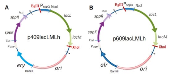 The fragment of lacLM genes, which was amplified with the primer pair FwdNcoI and Rev2XhoI (Table 5), was cloned into the lactobacillal expression vector pSIP409 using the NcoI and XhoI cloning sites, resulting in the plasmid p409lacLMLh. The ~3.0 kb of BglII-XhoI fragment of p409LacLMLh containing the fragment of lacLM genes was ligated into the ~5.8 BglII-XhoI digested fragment of pSIP609 yielding the plasmid p609lacLMLh (Figure 6). The plasmids p409lacLMLh and p609lacLMLh were constructed in E. coli NEB5α and MB2159, respectively, before being transformed into the expression hosts, L. plantarum WCFS1 and the D-alanine auxotroph L. plantarum TLG02, respectively. The overexpression of β-gal was performed as described previously []. Overnight cultures of L. plantarum carrying the plasmids p409LacLMLh and p609LacLMLh, respectively, were inoculated into 500 mL of MRS broth (for erm-based vector p409LacLMLh 5 μg/mL erythromycin was added) to an OD600 of ~0.1. The cultures were incubated at 30 °C to an OD600 of 0.3 prior to induction with an inducing peptide pheromone IP-673 to a final concentration of 25 ng/mL. Cells were harvested at OD600nm of 1.8 to 2.0. The cells were harvested by centrifugation (4000 g, 4 °C for 15 min), washed twice and resuspended in 0.5 mL of 50 mM sodium phosphate buffer (NaPB), pH 6.5. Cells were disrupted on ice by sonication (Bandelin Sonopuls HD60, Berlin, Germany). The crude recombinant enzymes from L. plantarum WCFS1, Lp409Lhβ-gal, and L. plantarum TLG02, Lp609Lhβ-gal, were obtained after centrifugation (10,000× g for 15 min at 4 °C) and tested for β-galactosidase activity using the standard enzyme assays and protein concentrations.