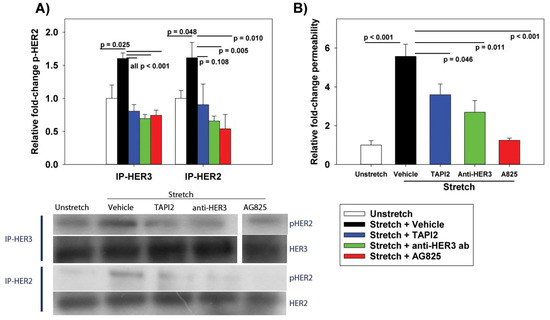 Effect of cyclic stretch (ΔSA 37%, 0.25 Hz, 10 min) and HER pathway inhibition on (A) human epidermal growth factor receptor-2 (HER2) activation and (B) permeability. (A) HER2 activation was measured by Western blot analysis of pHER2 after IP by (separately) anti-HER3 or anti-HER2 antibody. (B) Permeability was measured by BODIPY-ouabain fluorescence. Treatment with the NRG1-cleavage inhibitor TAPI2 (50 µM), anti-HER3 antibody (10 µg/mL), and HER2 phosphorylation AG825 (50 µM) mitigated stretch-induced increases in pHER2 and permeability. Values are normalized to unstretched cells. n = 5; p values represent the result of ANOVA and post-hoc Tukey.