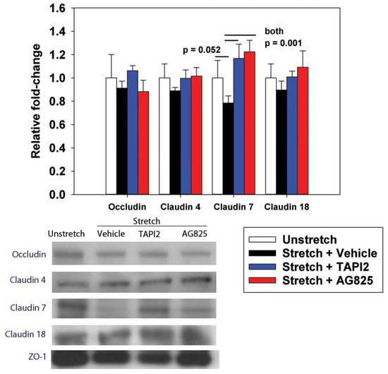 To test whether the improved permeability with HER2 inhibition was mediated via tight junction proteins, we assessed the expression of zonula-occludens 1 (ZO-1)-bound proteins after treatment with TAPI2 and AG825. Cyclic stretch decreased ZO-1-bound claudin-7 expression, which was prevented by treatment of both TAPI2 and AG825 (Figure 3).