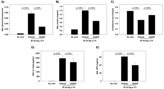 Effect of pre-treatment with AG825 (1.67 mg/kg IP × 3 days) on (A) lung permeability as measured by bronchoalveolar lavage (BAL): plasma fluorescence, (B) BAL protein concentration, (C) respiratory system compliance, (D) BAL Interleukin-1β, and (E) BAL myeloperoxidase levels in rats subject to injurious ventilation for 4 h (VT 25 mL/kg, end-expiratory pressure 0 cmH2O, rate 27 breaths/min, FIO2 0.21). AG825 improved permeability and compliance in this ventilator-induced lung injury (VILI) model, relative to vehicle (DMSO). n = 4; p values represent the result of ANOVA and post-hoc Tukey.
