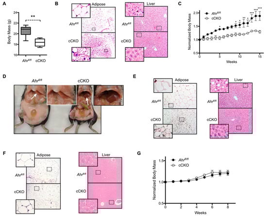 Constitutive loss of hepatocyte aryl hydrocarbon receptor (AHR) expression in female mice reduces weight gain and adiposity. (A) 10-week old female hepatocyte-targeted AHR conditional knockout mice (Ahrfl/flAlb-Cre, herein referred to as “cCKO”) exhibit significantly decreased body mass (n = 6 per genotype). (B) Hematoxylin and eosin (H&E)-stained perigonadal white adipose tissue (gWAT) shows increased multilocular lipid droplet formation in 10-week old female cCKO mice relative to Ahrfl/fl mice; however, H&E-stained liver sections show no apparent difference in hepatic morphology. (C) Female cCKO mice challenged with a high-fat diet (HFD) for 15 weeks exhibit decreased weight gain relative to Ahrfl/fl mice (n = 3 per genotype). (D) Gross morphology reveals extensive adiposity in HFD-fed female Ahrfl/fl mice compared to female cCKO mice. Additionally, livers (arrows, inset) in Ahrfl/fl mice presented with evidence of steatosis. (E) H&E-stained gWAT from HFD-fed female cCKO mice demonstrates reduced adipocyte size relative to Ahrfl/fl, while H&E-stained female Ahrfl/fl liver sections exclusively, exhibit steatosis. (F) H&E-stained gWAT and liver sections from 10-week old male Ahrfl/fl and cCKO mice exhibit similar morphology. (G) Male Ahrfl/fl and cCKO mice (n = 4 per genotype) maintained on HFD for eight weeks do not exhibit any significant change in weight gain. All microscopy images are shown at 200× magnification and representative of three animals. Areas enclosed by a dashed rectangle have been digitally zoomed and shown in the corresponding inset for clarity. Numerical data are presented as mean ± SEM. Statistical analysis was performed using a Student’s t test or two-way ANOVA with Bonferonni posttests. Significant differences are notated as * p < 0.05, ** p < 0.01, or *** p < 0.001.
