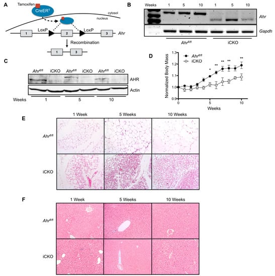 Induced loss of hepatocyte AHR expression in adult female mice reduces weight gain and adiposity. (A) Schematic outline of tamoxifen-induced AHR loss. Briefly, tamoxifen-activated Cre recombinase (Cre-ERT2) excises exon 2 from the genome, resulting in a truncated non-coding Ahr transcript. (B) Polymerase chain reaction (PCR) monitoring of Ahr transcript levels demonstrates exon 2 excision in tamoxifen-treated, inducible AHR conditional knockout mouse livers (Ahrfl/flAlb-CreERT2, abbreviated “iCKO”). (C) Tamoxifen treatment results in the sustained loss of hepatic AHR protein expression in iCKO mice. (D) Tamoxifen-induced AHR loss reduces weight gain in female iCKO mice maintained on standard rodent chow for 10 weeks (n = 6–7 per genotype). (E) H&E-stained gWAT collected from female iCKO mice at 1, 5, and 10 weeks after tamoxifen administration show decreased adipocyte size and increased multilocular lipid droplet formation. (F) H&E-stained liver sections from female Ahrfl/fl and iCKO mice at 1, 5, or 10 weeks post-tamoxifen treatment exhibit similar morphology. Protein data are representative of all mice at each time point shown. All microscopy images are shown at 200× magnification and representative of three animals. Numerical data are presented as mean ± SEM. Statistical analyses were performed using a Student’s t test or two-way ANOVA with Bonferonni posttests. Significant differences are notated as * p < 0.05 or ** p < 0.01.