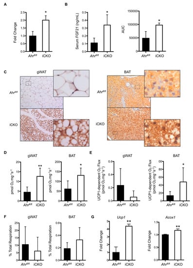 To examine why hepatic AHR deletion consistently results in reduced adiposity and increased multilocular lipid droplet formation in gWAT, we conducted a deep sequencing transcriptomic analysis on liver RNA isolated from Ahrfl/fl and iCKO livers at one week post-tamoxifen treatment. We chose to focus on the expression of genes involved in the liver-adipose signaling axis because of the targeted deletion of AHR to the liver and the phenotype observed in gWAT. Table 1 highlights several significant changes in hepatokine expression. In agreement with previous data showing that AHR loss increases Fgf21 transcription [], we observed an approximate two-fold increase in the expression of Fgf21 in iCKO mice. Subsequently, we validated this observation using quantitative polymerase chain reaction (PCR) analysis (Figure 3A). Circulating FGF21 protein concentrations were also significantly elevated two- to three-fold in iCKO mice relative to Ahrfl/fl controls, as measured by both ELISA and a novel Selected Reaction Monitoring mass spectrometry methodology (Figure 3B). Consistent with the observed increase in hepatic FGF21 production and the known functions of FGF21, immunohistochemical staining for UCP1 was enhanced in gWAT tissue from iCKO mice, and revealed an increase in the formation of multilocular lipid droplets relative to floxed controls (Figure 3C). Brown adipose tissue deposits also exhibited enhanced UCP1 staining in iCKO mice relative to Ahrfl/fl. At five weeks post-tamoxifen administration, the respiratory capacity of permeabilized gWAT tissue from iCKO mice was a significant 2.8-fold greater than in Ahrfl/fl mice (Figure 3D). Respiratory capacity also significantly increased 2.1-fold in brown adipose tissue (BAT) isolated from iCKO mice relative to Ahrfl/fl. UCP1-dependent respiration was modestly lower in gWAT, but a significant 3.6-fold greater in BAT (Figure 3E). Figure 3F shows that the ratio of UCP1-associated respiration to total respiration is not statistically different between gWAT isolated from Ahrfl/fl and iCKO mice, which indicates that AHR loss does not meaningfully alter UCP1 functionality in this tissue. This ratio is slightly elevated in BAT from iCKO, consistent with the significant increase in UCP1-dependent respiration (Figure 3B), albeit falls short of statistical significance (p = 0.15). Despite no apparent change in UCP1 function in iCKO gWAT, Ucp1 transcript remained elevated 4.3-fold at five weeks post-tamoxifen administration (Figure 3G). A significant 17% increase in acyl-CoA Oxidase 1 (Acox1) gene expression relative to Ahrfl/fl further suggests elevated turnover of lipids within gWAT deposits from iCKO mice at this timepoint.