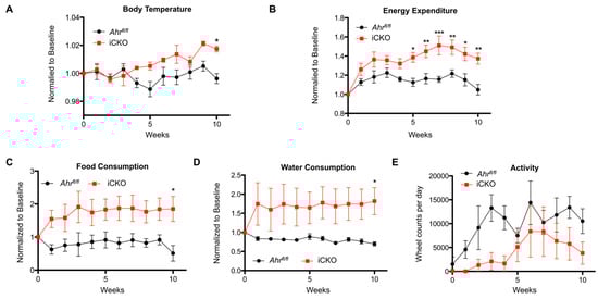 Next, we used the non-invasive Comprehensive Laboratory Animal Monitoring System (CLAMS™, Columbus Instruments, Columbus, OH, USA) to simultaneously monitor food and water intake, physical activity, core body temperature, and to perform indirect calorimetry and determine energy expenditure. Ahrfl/fl and iCKO mice were continuously monitored over a 24 h time period, once per week, for 10 weeks. The data presented in Figure 4A–E encompass the 12-h dark cycle when the mice were most active and differences were observed between the genotypes. Consistent with the significant increase of respiratory capacity in gWAT and BAT upon induced AHR loss (Figure 3D), iCKO mice maintained elevated body temperature (Ahrfl/fl slope: 0.00004 ± 0.0004 week−1, iCKO slope: 0.00214 ± 0.0004 week−1, p = 0.0006) and energy expenditure (Ahrfl/fl slope: 0.0003 ± 0.0005 week−1, iCKO slope: 0.0303 ± 0.0071 week−1, p = 0.002) (Figure 4A,B). iCKO mice also consumed significantly more food and water; however, they appeared to be less active overall (Figure 4C–E), suggesting that the increased energy expenditure was attributable to increased respiration in gWAT (Figure 3D) and increased thermogenesis in BAT (Figure 3E).